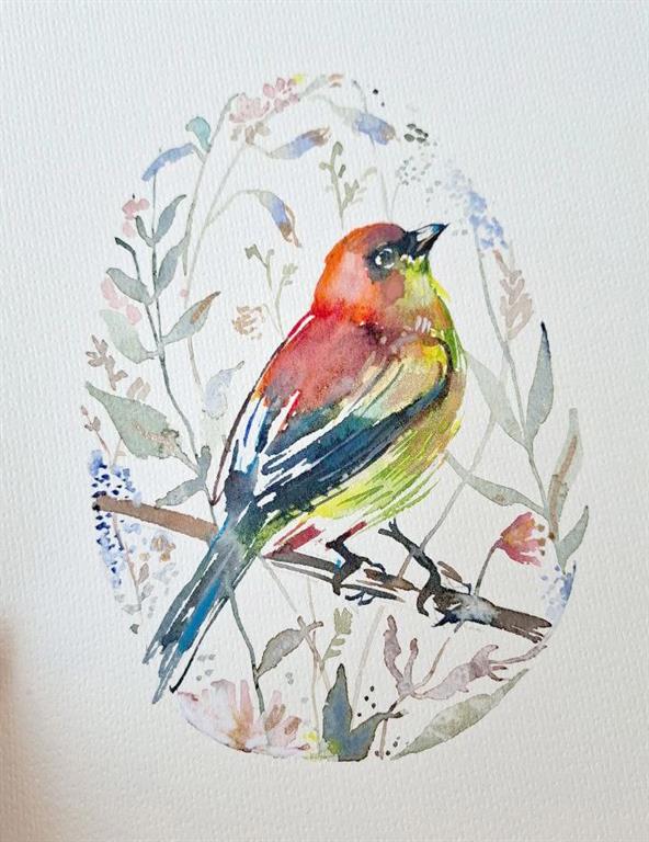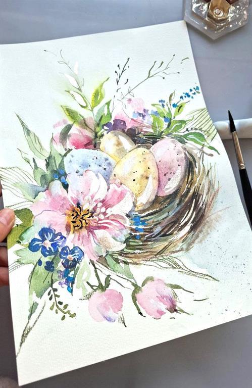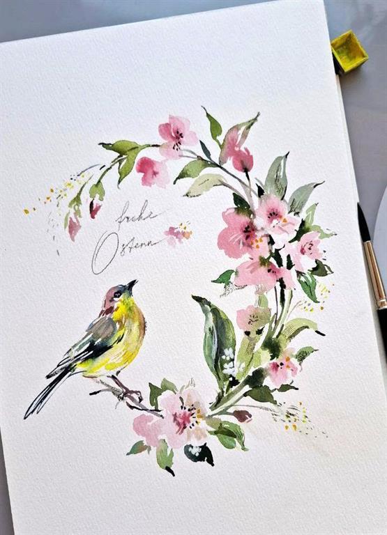 Die Teilnehmer lernen, wie man mit Aquarellfarben und -stiften wunderschöne Osterkarten malt. Es wird gezeigt, wie ein schönes Frühlingsmotiv mit einem Vogel und Ostereiern gezeichnet wird.