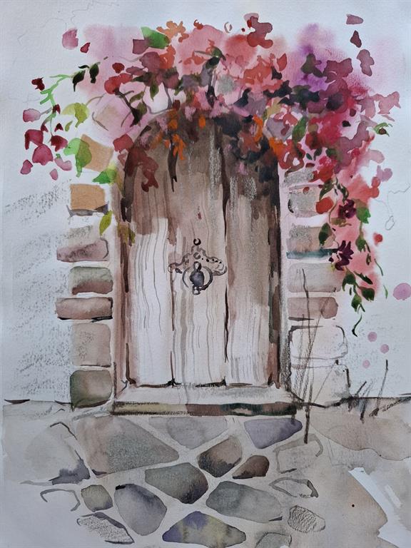 Die Teilnehmer erlernen die grundlegenden Techniken der effektiven Übertragung von Licht-Schatten am Beispiel des Motivs mit einer von Blumen und Zweigen umgebenen Tür.