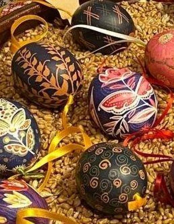 Sie lernen, wie man Eier mit Wachs und Farben oder mit Wachs und Essig bemalt und dabei traditionelle Ornamente sowie originelle Kompositionen erstellt: