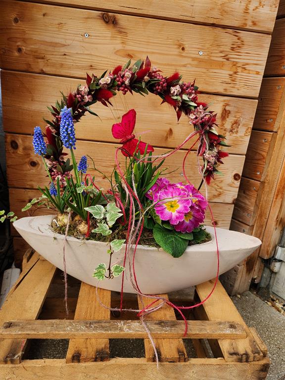 Bei diesen Workshop wird eine Betonjardiniere mit sommerlichen Blumen bepflanzt und mit einem gebundenem Loop aus Trockenblumen dekoriert. Dieses besondere Werkstück ist ein echter Blickfang und kann saisonal immer wieder neu bepflanzt und dekoriert werden.