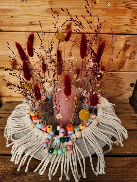 Bei diesem Workshop kannst du deiner Kreativität freien Lauf lassen. Wir dekorieren ein Windlicht außen mit vegetativ angeordneten Trockenblumen in Perlen und veredeln das Ganze zum Schluss noch mit einem Makramee.