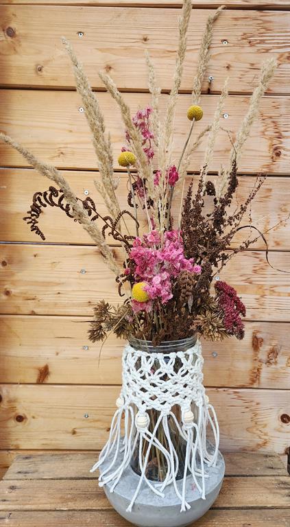 Bei diesem Workshop kreieren wir ein wildes Arrangement aus Wiesengräsern und Blüten in einer Vase, mit einer alternativen Steckhilfe. Dann erstellen wir Schritt für Schritt ein aufwendig geknüpftes Makramee, mit dem wir außen das Glas noch veredeln. Dieses Werkstück kann saisonell immer wieder umgestaltet oder neu dekoriert werden.