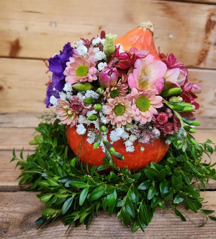 Bei diesem Workshop gestalten wir einen Blütenkürbis. Für diese florale Deko wird ein Kürbis ausgehöhlt, mit Steckschaum befüllt und mit frischen, saisonalen Schnittblumen gesteckt.